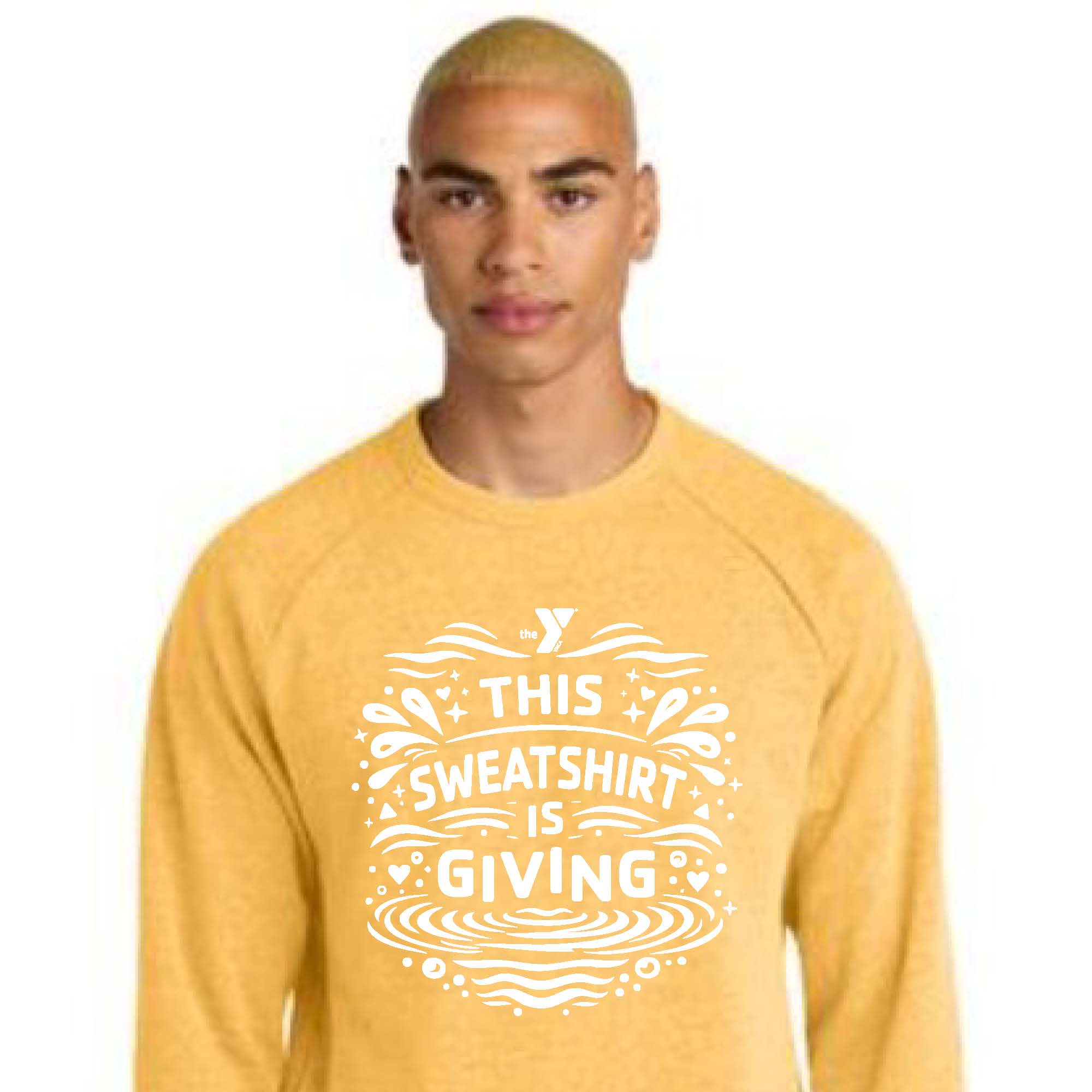 Exclusive tumbler for YMCA employees who give at least $75 to the Annual Campaign. Sunshine yellow crewneck sweatshirt with "This Sweatshirt is Giving" design.